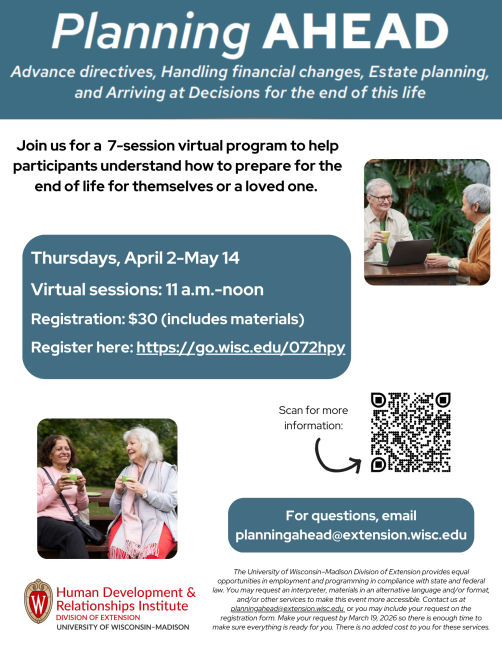 For additional information about the program, go to: https://aging.extension.wisc.edu/programs/planning-ahead/#about