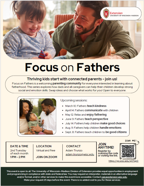 Focus on Fathers is a welcoming parenting community for everyone interested in learning about fatherhood. This series explores how dads and all caregivers can help their children develop strong social and emotion skills. Swap ideas and choose what works for you! Open to everyone.